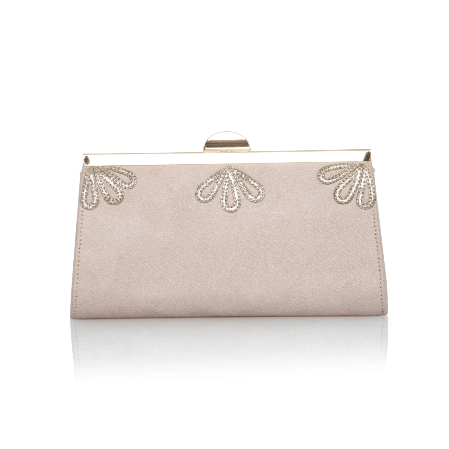 This beautiful Blush ultra suede clutch is a sleek vintage themed bag with a deco inspired soft gold shimmer design across the top below a metal snap fastener. The bag is lined with a blush satin lining and comes with an optional chain strap for hands free. This design is perfect for any occasion and is a classic accessory!