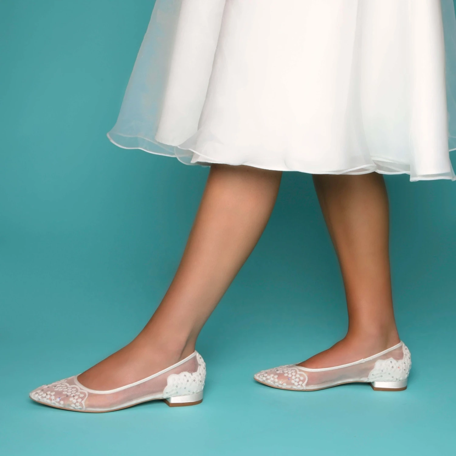 Perfect Bridal Tess Shoes. Tess is a beautiful ballerina flat shoe with simple ivory sequin lace and sheer mesh side panels.