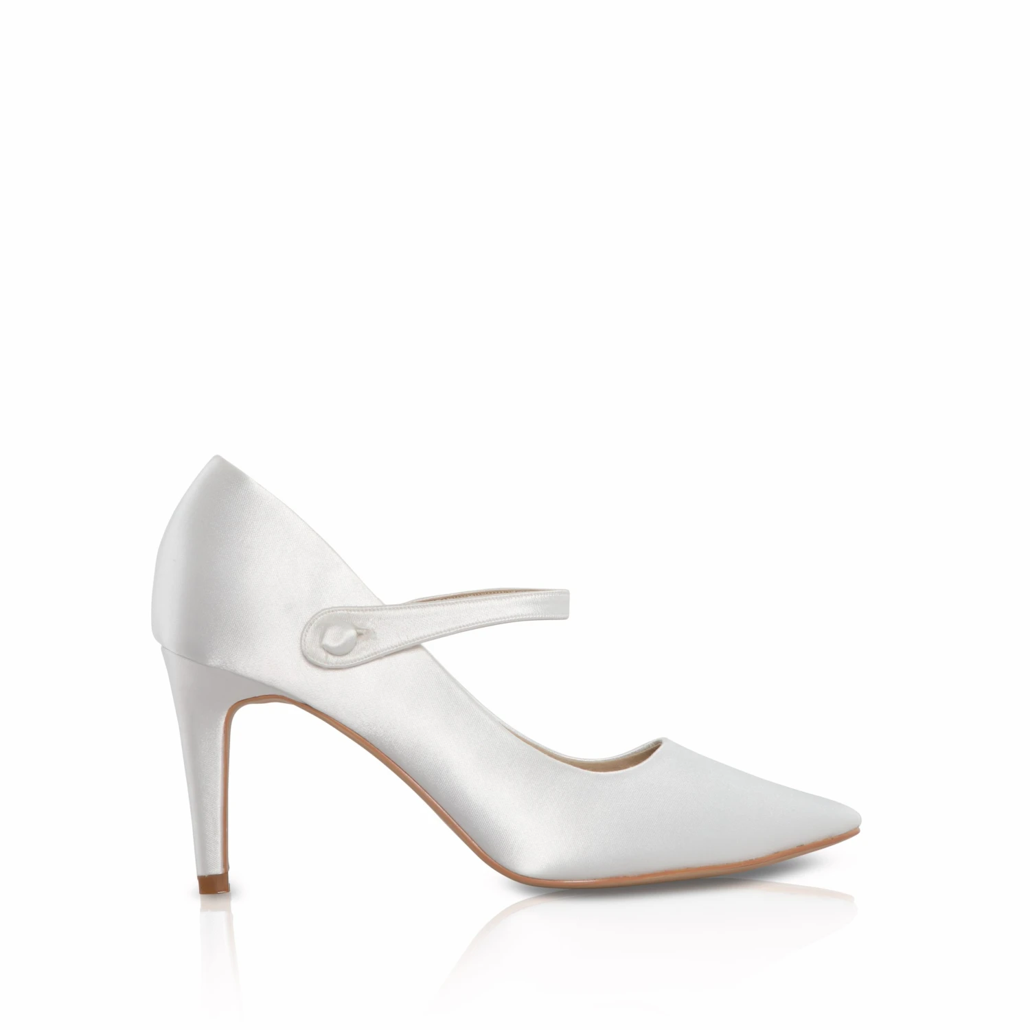 Perfect Bridal Thea Court Shoes. A perfectly elegant, ivory satin simple court shoe with a slim heel, strap and soft almond toe, perfect for dyeing. Perfectly comfortable all day long with a leather and fabric cushioned lining and fully cushioned leather sock!