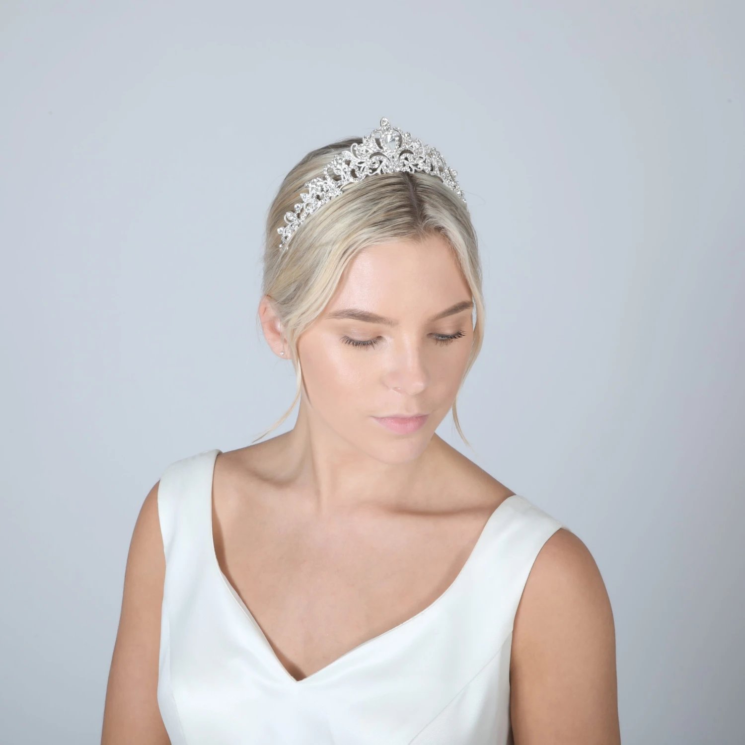 Stunning classic and elegant tiara set with crystal stones in a beautiful silver finish. A large marquise cut crystal stone is the perfect accent for this traditional crown. This beautifully elegant simple and classic crown really is a beautiful addition to your bridal gown, it gives a lovely elegant feel to your bridal attire.