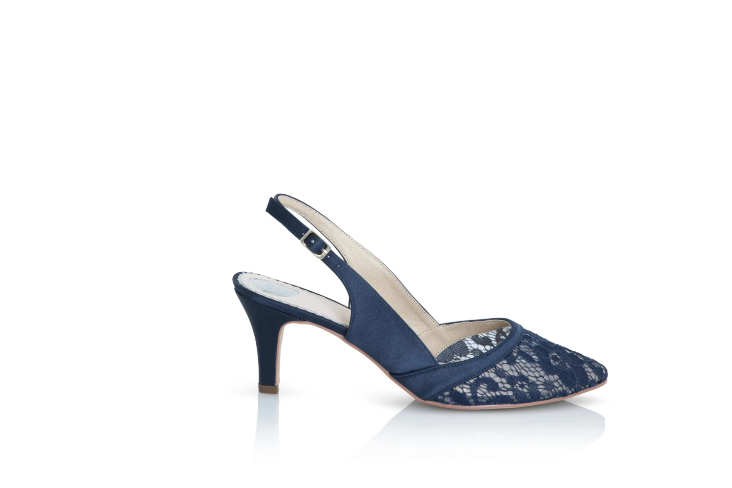 Perfect Bridal Vera Shoe in Navy Satin with lace cut out. Vera are a satin mid heeled sandal with a fully enclosed pointed toe incorporating the Lace cut out, court heel and sling back to keep you feeling in control. The lace adds that bit of glam. This shoe is perfect for the whole wedding day and the evening reception, to dance the night away!