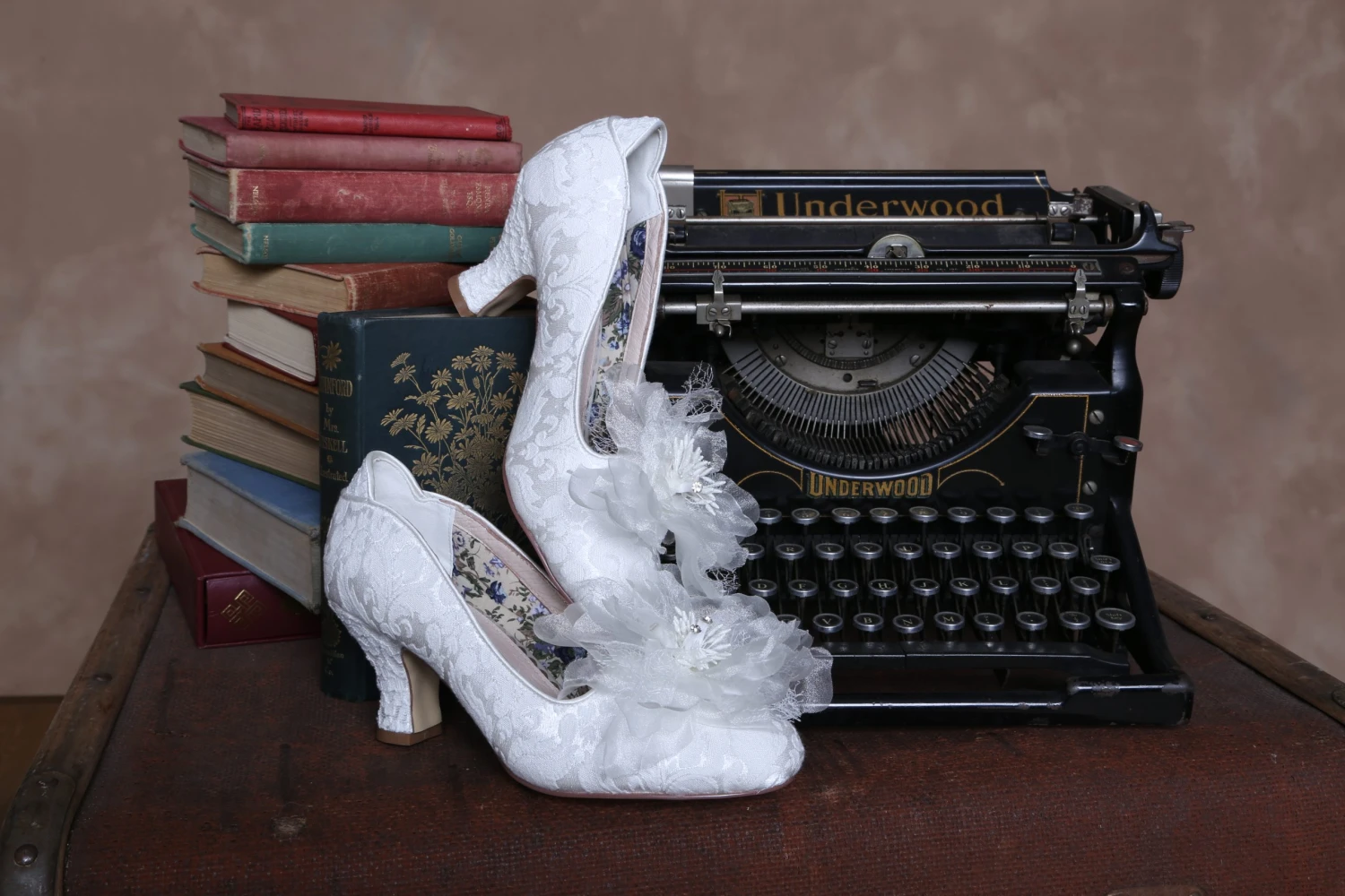 Perfect Bridal Vivian Bridal Shoes in Ivory Brocade and Lace. Vivian is the epitomy of a delicate vintage inspired court shoe. The soft sheen of the brocade fabric is perfectly complimented by the floral lace covered French style heel! Mid height and fully cushioned throughout for extra comfort!