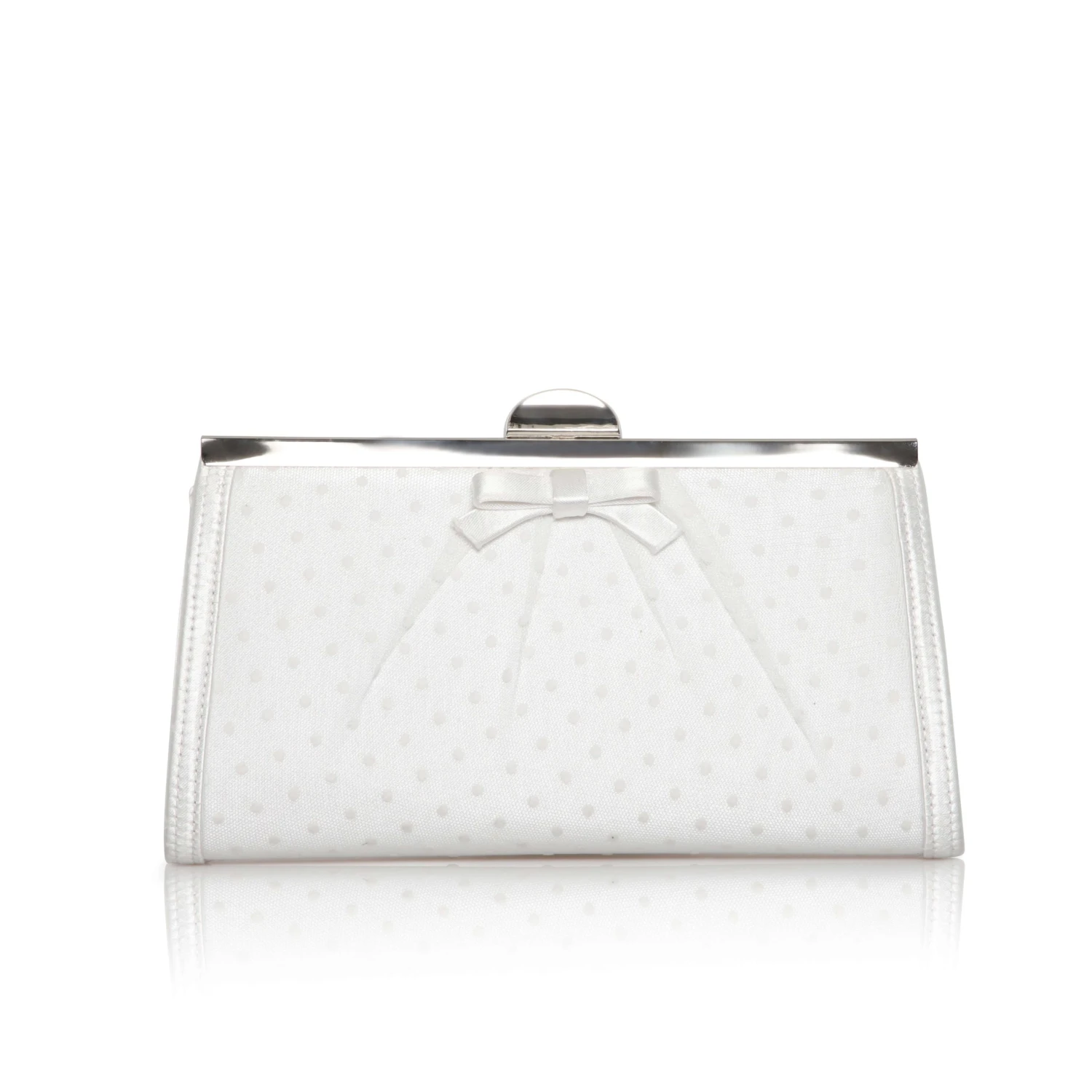 This beautiful Willow clutch is sleek with a snap fastener. A trapeze shape bag with dyeable pleated spot mesh over satin and a beautiful satin bow. A silver finish chain enables this to be a hands free bag if required. This design is perfect for any occasion and is a classic accessory.