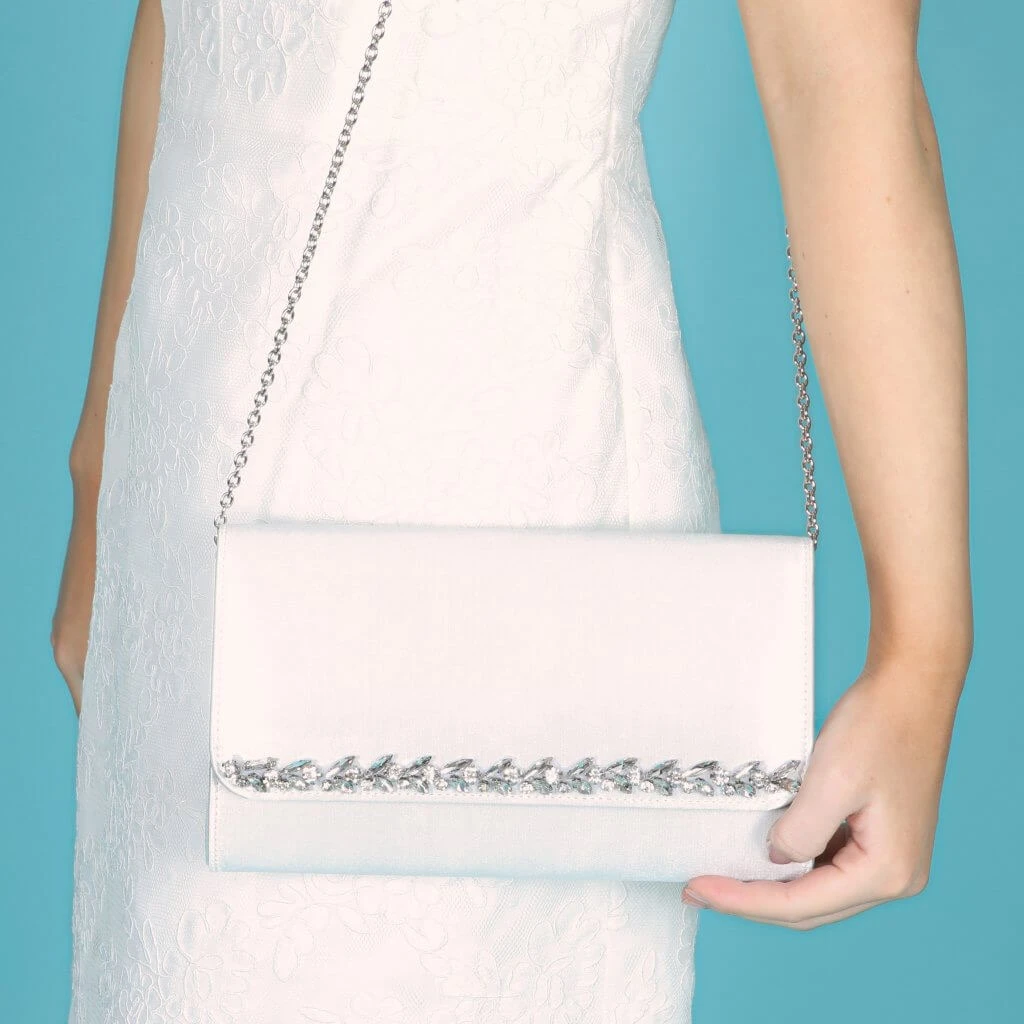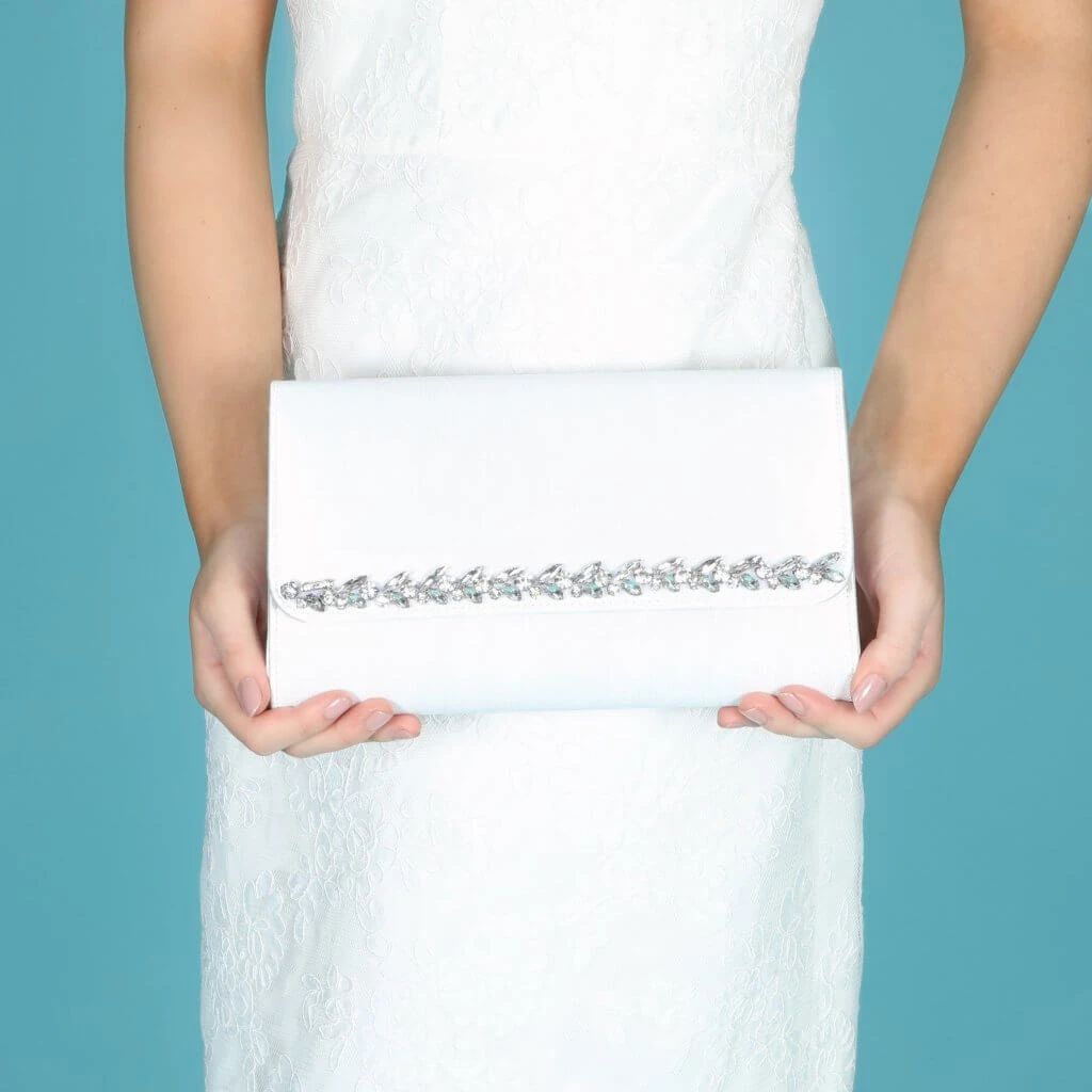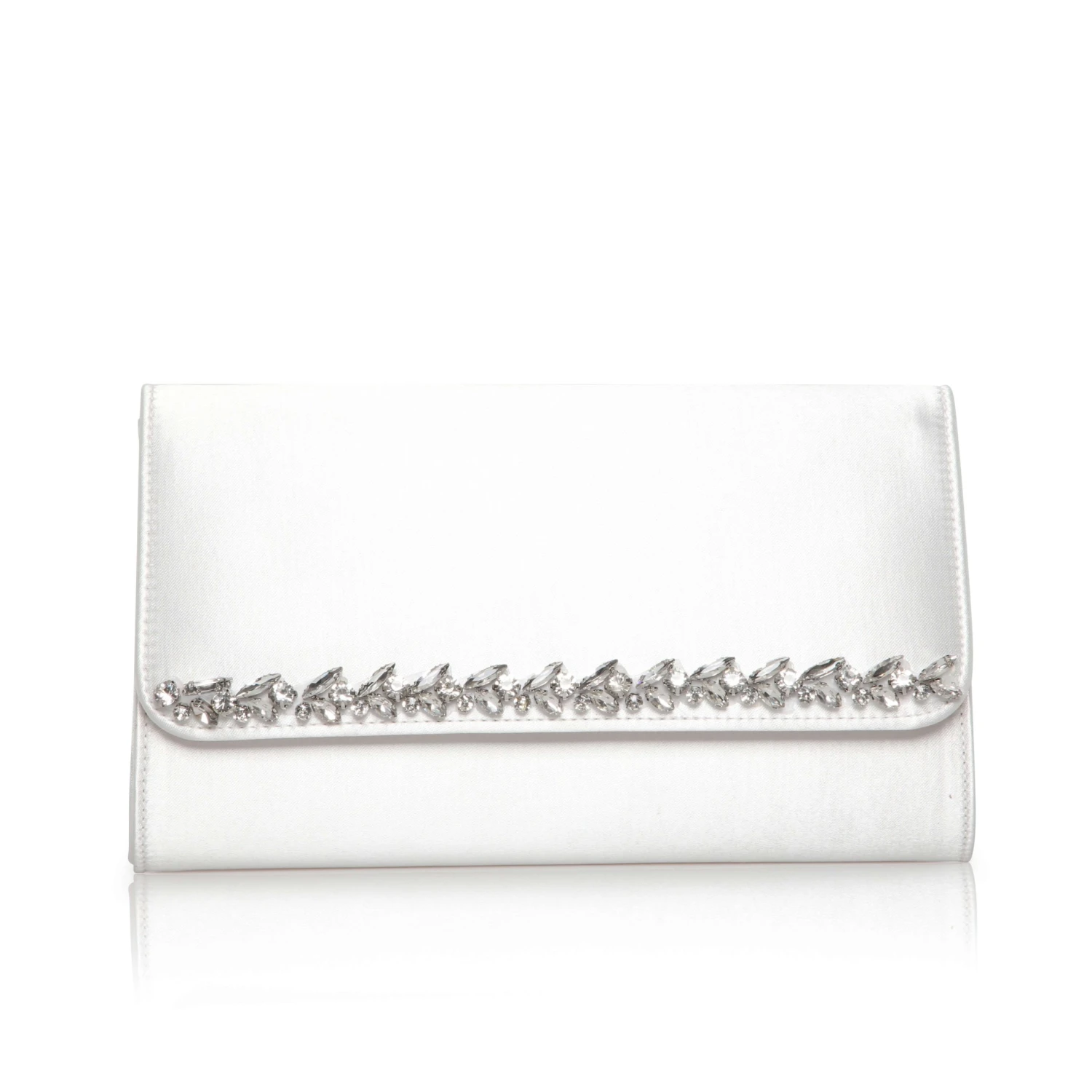 Perfect Bridal Yvette Handbag. A modern, assymetric flap compact clutch bag in Dyeable ivory satin with a horizontal band of round and marquise cut crystal across the flap which fastens with a magnetic clasp!