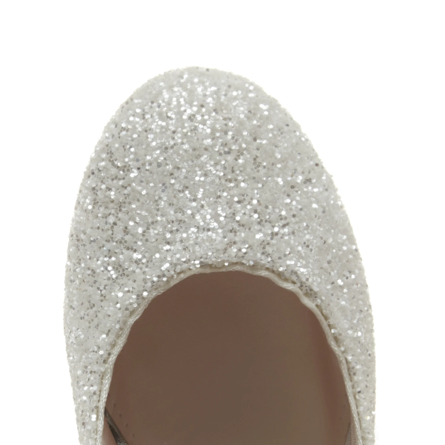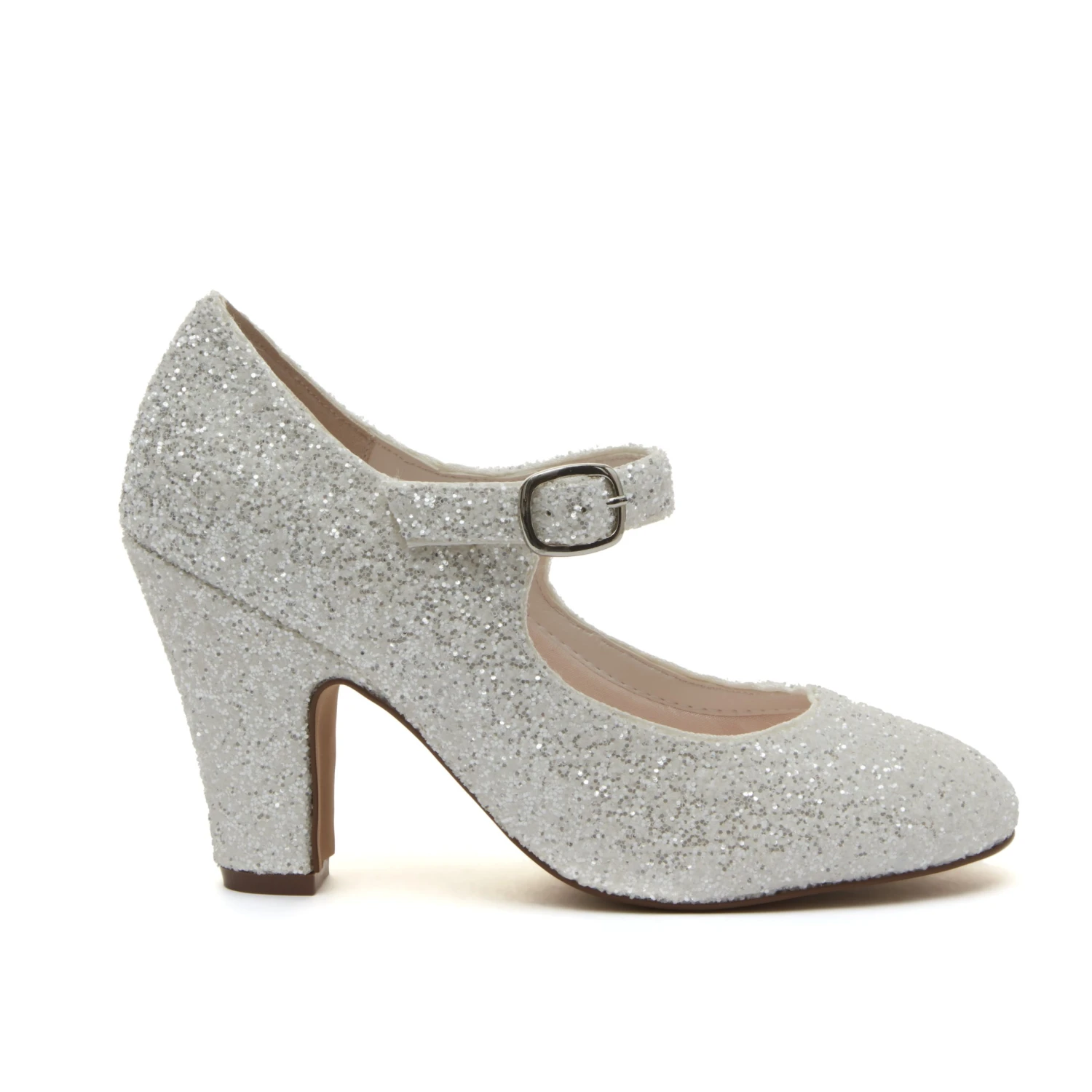 Rainbow Club Madeline in an Ivory Snow Glitter is from the Fashion Collection with a fabulous Mary Jane shoe shape, block heel and ultra comfortable retro straps with silver buckle detail.