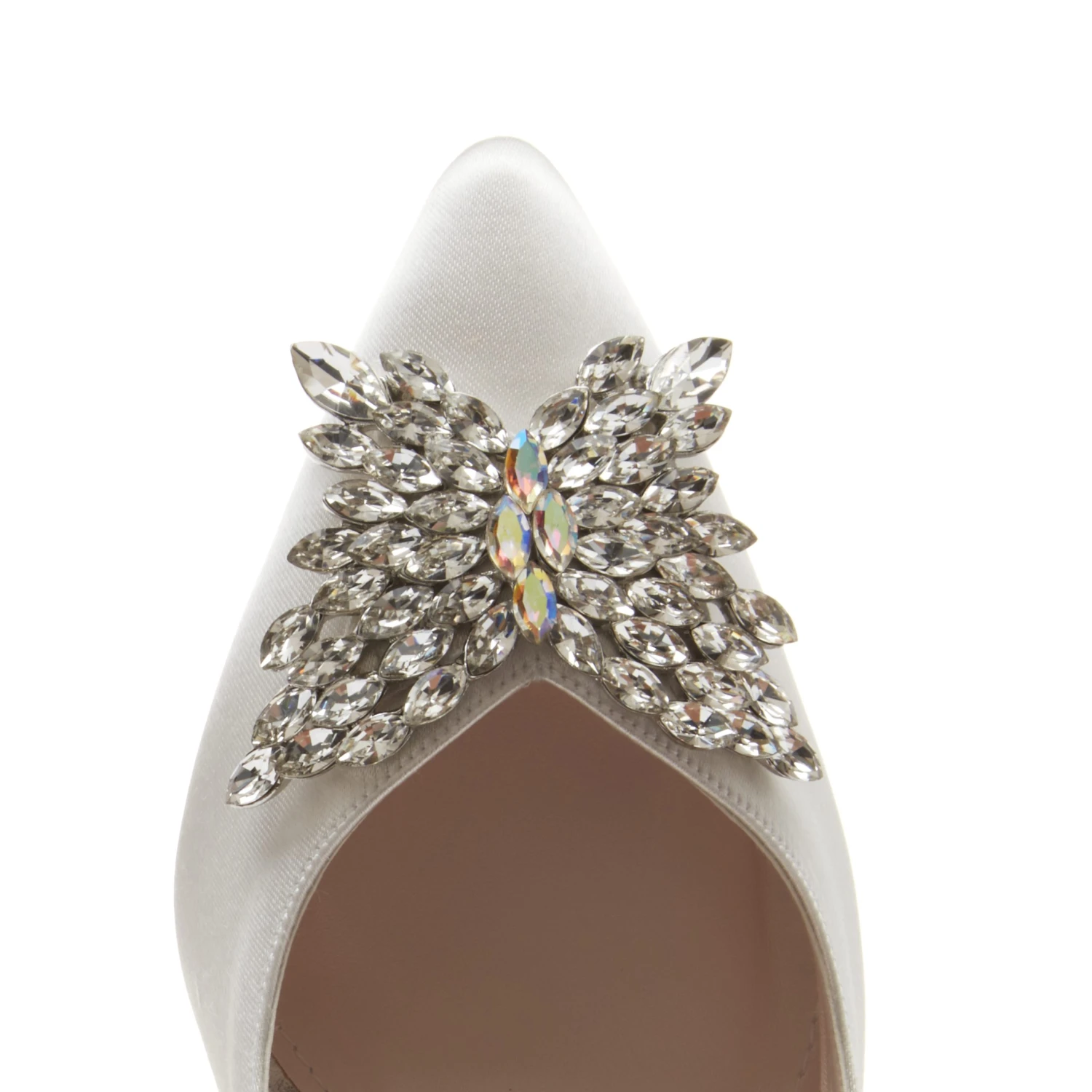 The Nelly Ivory Satin Embellished Court Shoe is understated but with a touch of glamour, minimalist brides will love Nelly, a new wedding shoe in our Fashion Collection. Crafted from lustrous ivory satin, these contemporary wedding shoes have a pointed toe and elegant stiletto heel. A crystal butterfly brooch gives these shoes that touch of bling!