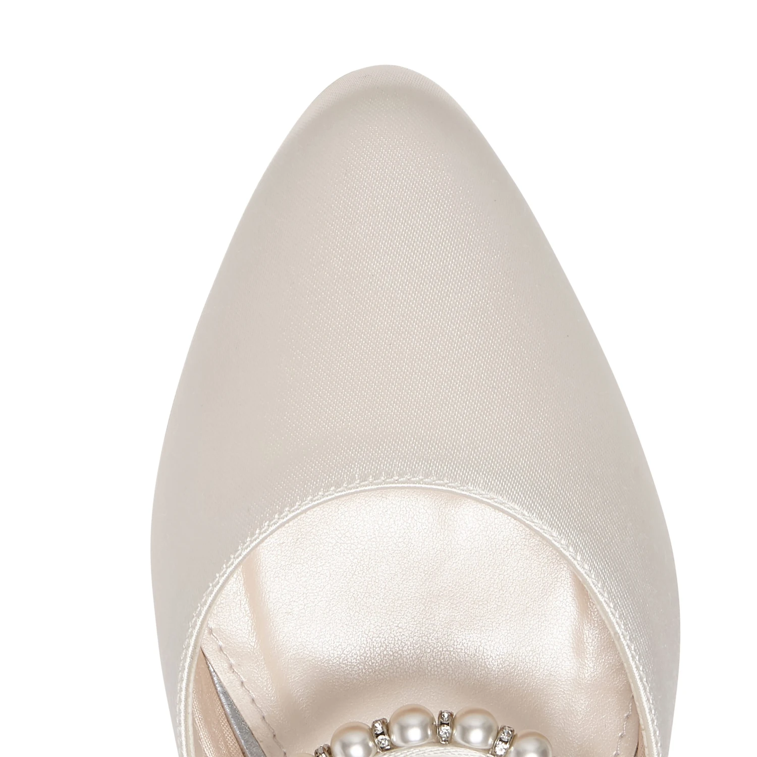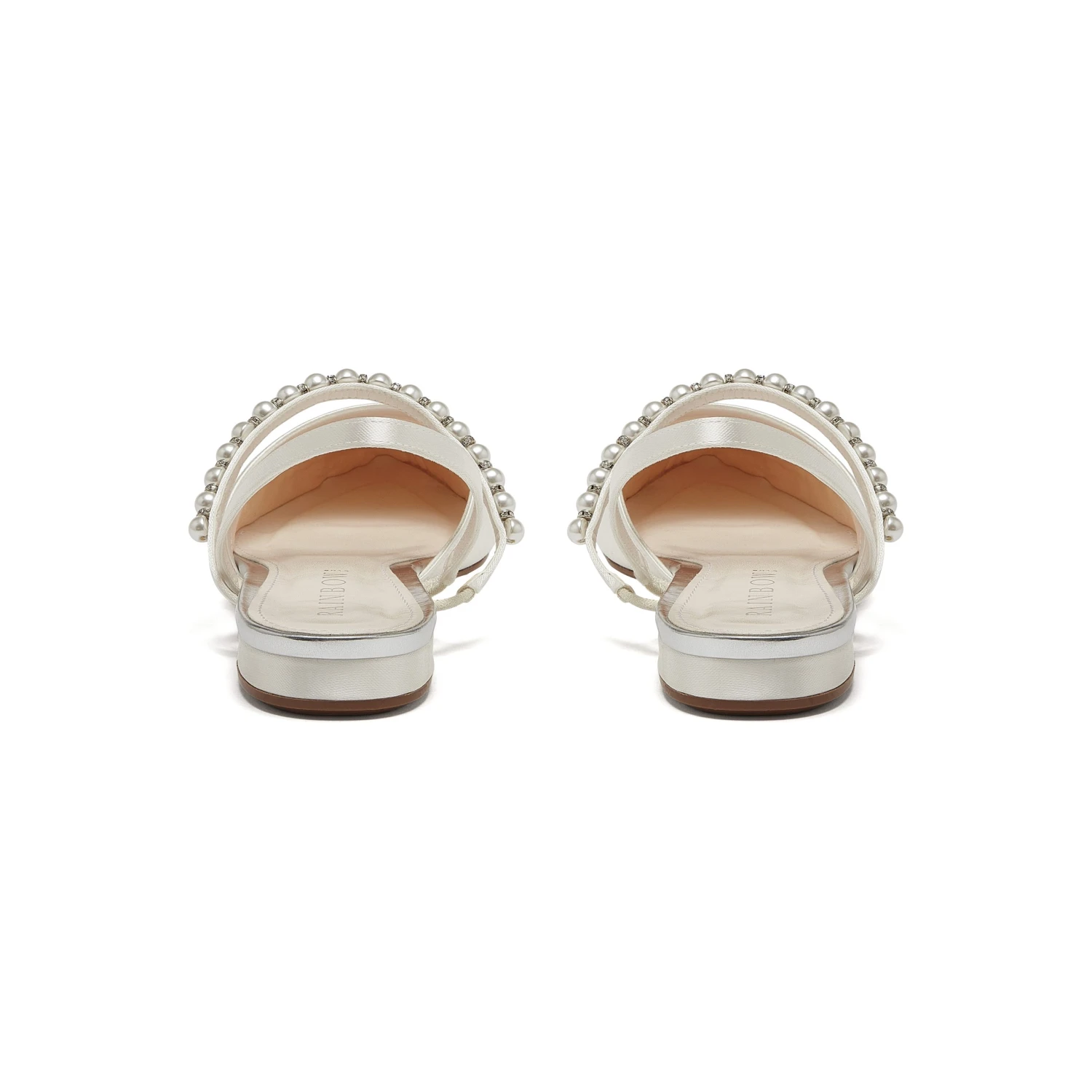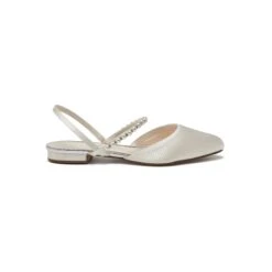 Rainbow Romi Sling back shoe in Ivory Satin with silver leather trim. Freya are a satin, flat heeled sandal with a fully enclosed almond toe , sling back with buckle to keep you feeling in control. The strap across the front of the foot is covered in pearls and sparkly diamante crystals to add that bit of glam. This shoe is perfect for the whole wedding day and the evening reception, to dance the night away!