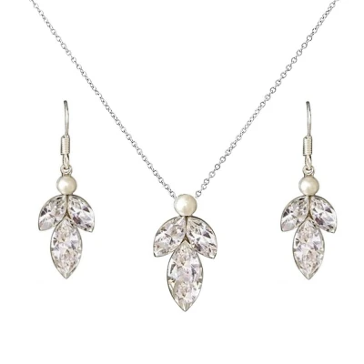 Sass B Collection Dainty Drop Necklace set. A feminine and utterly stylish, pearl and glass cut crystal necklace set in a sparkling leaf design with a pretty and delicate tiny pearl. The matching drop earrings are a stylish leaf design of sparkling crystals and a tiny accent pearl! Â
