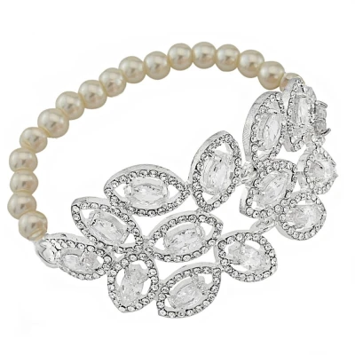 Sass B Collection Statement Stretch Bracelet with a large crystal embellished statement piece. An utterly stunning and perfectly chic luxury simulated ivory pearl bracelet crafted with clear crystals on a silver finish!