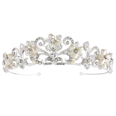 Sass B Lorena is a luxurious crystal and pearl tiara in a high quality and unique design. A beautiful tiara with high quality cz crystals and ivory pearls on a silver plated finish!Â