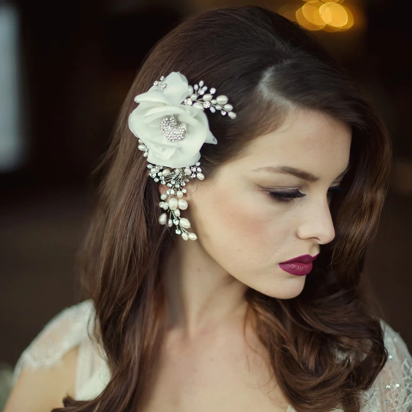 Sass B Miriam headpiece – an oh so stunning and utterly glamorous fabric and crystal floral wedding headpiece with a stunning, ivory fabric florette accented with sparkling Swariovski crystals in a floral and spray design and embellished with luxury freshwater pearls!