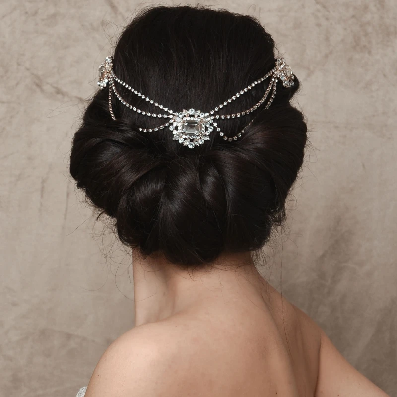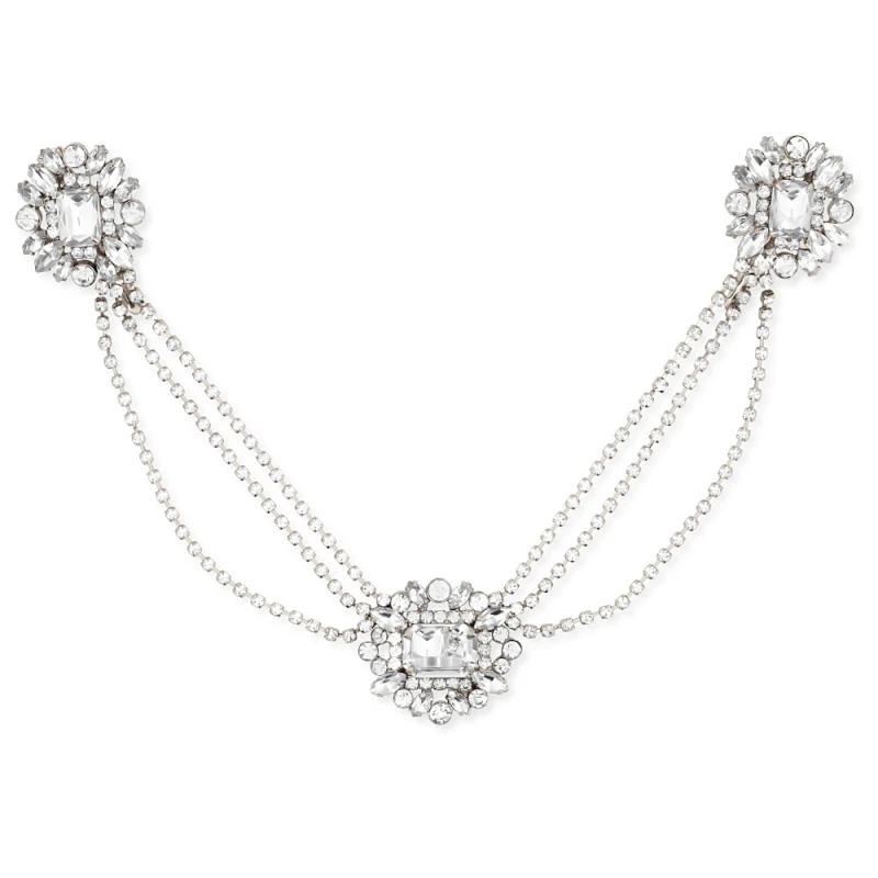 The Sass B luxurious headpiece is a true statement hair vine designed to be worn across the forehead or round the back of the head. Three domes are connected by three strands of crystals , each dome consists of a large, emerald cut central crystal surrounded by multiple marquise and brilliant cut crystals to create a truly glamorous look!