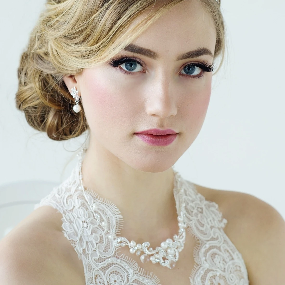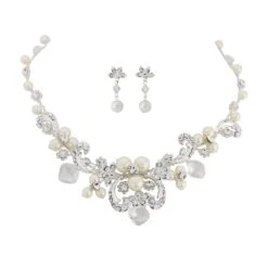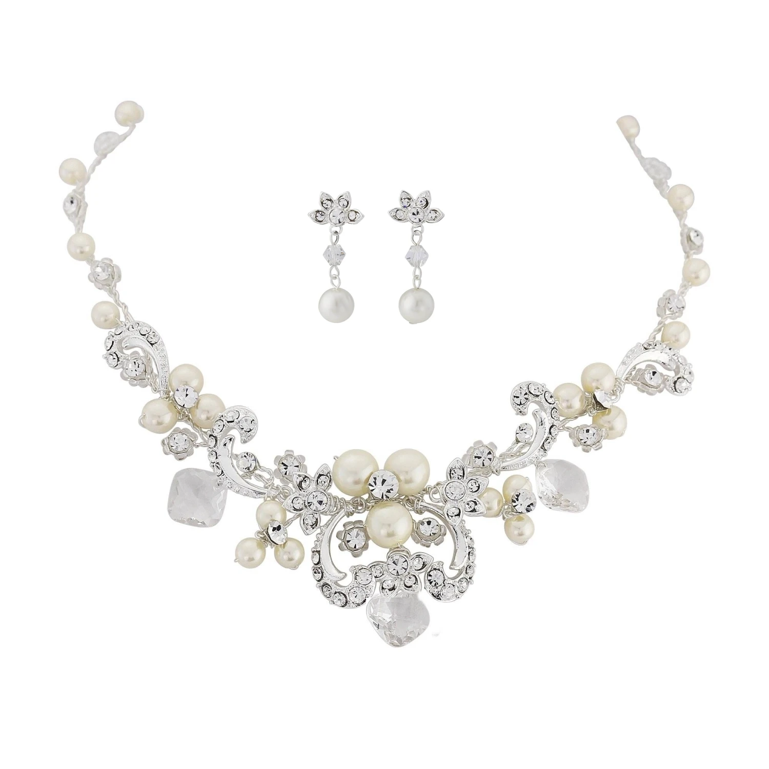 Vintage Dream pearl and crystal bridal necklace set. A chic and utterly vintage-inspired necklace set with intricate swirls embedded with sparkling crystals, bead accents and pearl clusters to add a feminine bridal touch!