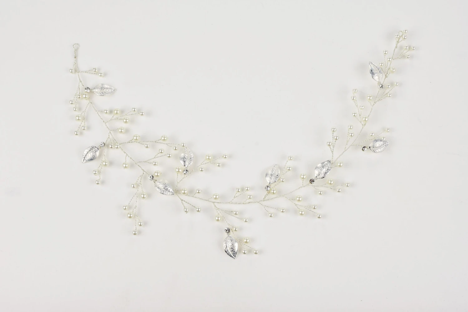 Magnolia is a dainty and delicate hair vine that can be woven into any type of hairstyle. Magnolia is simplistic with small, pearl sprigs stretching from the base. The small metal leaves make Magnolia seem like it is a real natural vine.